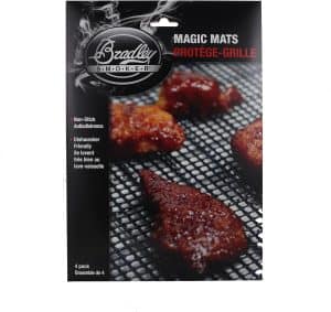 Je m’étais débrouillé en utilisant des tiges de bois pour les brochettes mais ça ne donnait pas un résultat intéressant. En voyant mes photos, il m’a conseillé les Magic Mats de la compagnie Bradley. Ce sont des petit tapis pleins de trous dans un materiau anti-adhésif ce qui permet à la fumer de passer sans problème tout en retenant vos aliments sur vos rack. De plus, il est absolument impossible d’y faire coller quoique ce soit ce qui me donne le goût de l’utiliser même quand ils ne sont pas requis pour m’éviter du nettoyage difficile.
